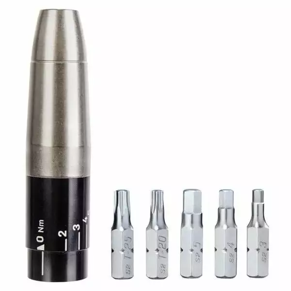 Cette clé est d’une précision remarquable pour des serrages au couple de 2 à 6 Nm et ne dépareille pas dans un atelier professionnel. Livrée avec 5 embouts, elle subviendra à vos besoins à la maison comme pendant l’entrainement, en se glissant dans votre sacoche ou votre poche avec son petit gabarit et son poids plume (64 g).