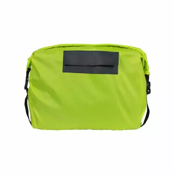 La housse est réglable avec une fermeture à enroulement qui se ferme sur les côtés avec une fermeture à clic. De cette façon, vous pouvez ajuster la housse de pluie à votre sac. Dans cette version horizontale, elle conviendra à des sacoches de porte-bagages arrière.