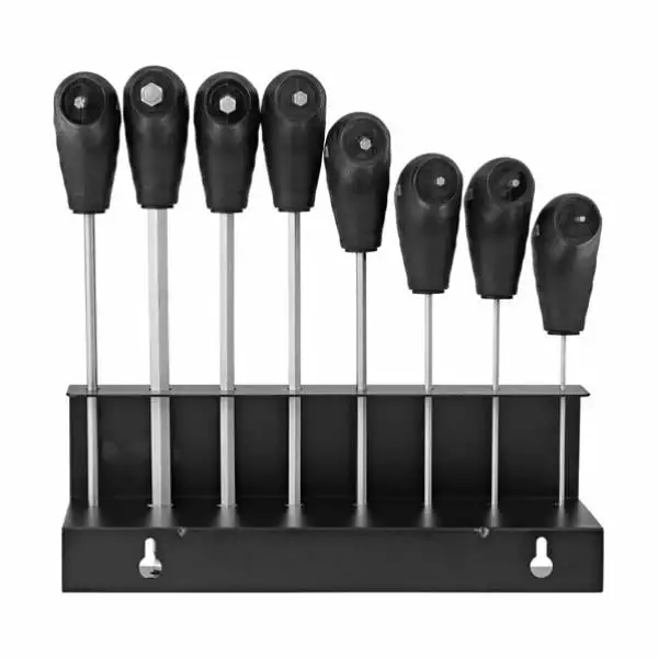Le kit inclus les clés 2, 2.5, 3, 4, 5, 6, 8 mm et T25, ainsi qu’un support de rangement mural très pratique pour retrouver rapidement la clé et organiser son atelier.