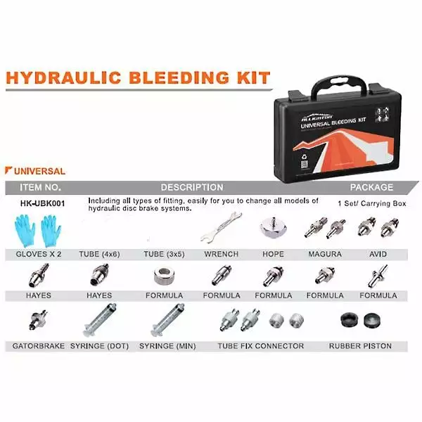 Le kit de purge universel ALLIGATOR peut être utilisé sur tous les freins, en Dot comme en minéral.