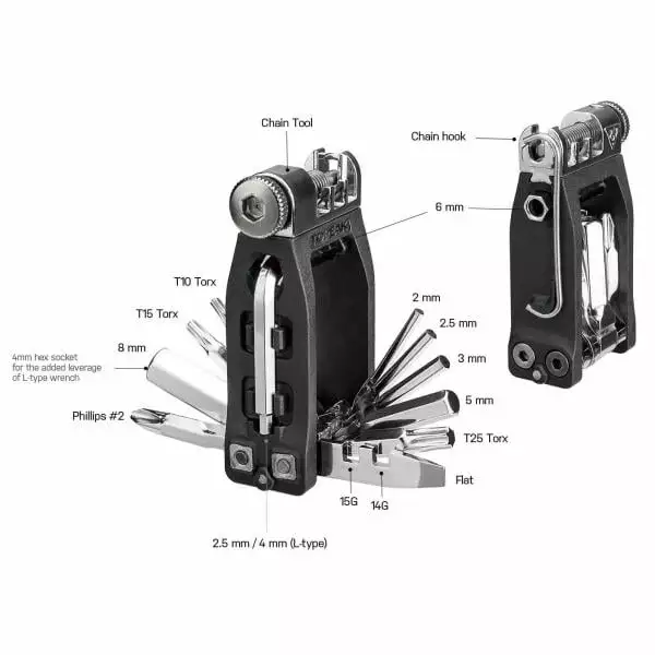 Ce modèle est conçu en acier Vanadium solide pour un usage sur route ou en VTT. Il est doté de différentes clés Allen et Torx et d’un dérive-chaîne compatible jusqu’à 12 vitesses (hormis Campagnolo).
