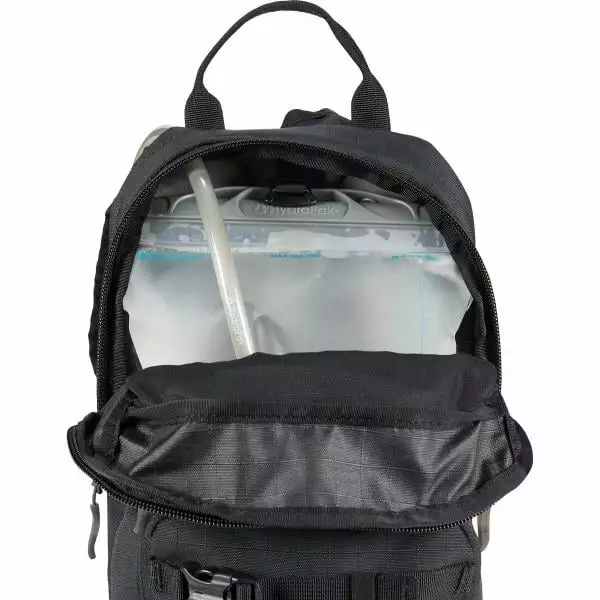 Son réservoir Hydrapack a une capacité de 2 litres. Son tuyau, doté d’un embout Phaser, est maintenu sur la bretelle gauche.
