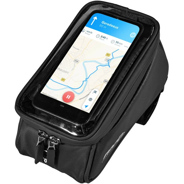 Cette sacoche utilise un tissu polyester imperméable mais est aussi dotée d’une housse de pluie. Elle garde les affaires au sec malgré les intempéries. Sur le dessus, une poche est destinée aux smartphones avec un écran transparent permettant l’utilisation de l’écran tactile. En dessous, un espace de rangement pratique permet de ranger des barres, de l’argent cartes ou un porte-monnaie.
