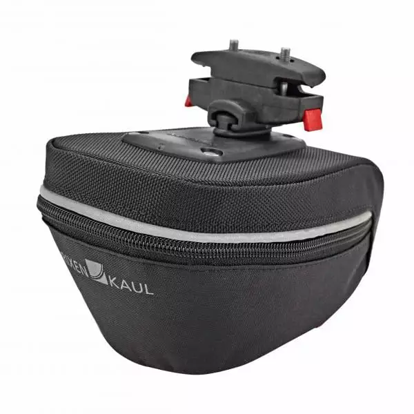 Elle est fournie avec son support de fixation, qui s’installe sur les rails de la selle. La sacoche vient se clipser dessus et se libère facilement, quand vous pressez les boutons rouges. KLICKFIX intègre un joint antivibration au niveau de la fixation, pour éviter les bruits parasites.