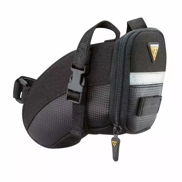 Signée TOPEAK, cette sacoche se fixe facilement à la tige de selle à l’aide d’une sangle ajustable.